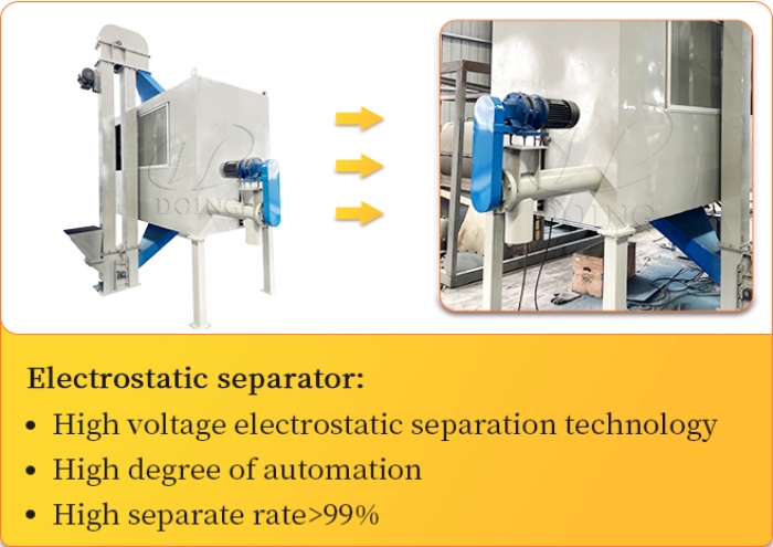 DOING recycling machine adopts two separate method - air separation and electrostatic separation, to separate metals from non-metals, with the separating rate of 99%.